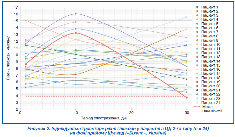 Складність патогенезу цукрового діабету та необхідність терапії протягом всього життя обумовлюють потребу в пошуку безпечних і ефективних додаткових засобів підтримки метаболічного контролю. Нутрицевтики з доведеною гіпоглікемічною активністю є перспективним напрямком цієї додаткової складової. З огляду на багатофакторність цукрового діабету використання дієтичної добавки Шугард («Біхелс», Україна), до складу якої входять рослинні компоненти, піколінат хрому та вітамін D, впливає на основні патогенетичні ланки захворювання, зокрема постпрандіальну глікемію, секрецію інсуліну, інсулінорезистентність та запальні процеси. Клінічні спостереження підтвердили її безпеку у стандартному дозуванні як доповнення до основної терапії, без значних побічних ефектів і коливань глікемії. Водночас для остаточного підтвердження ефективності та довгострокової безпеки необхідні масштабніші та триваліші дослідження, зокрема контроль глікованого гемоглобіну, біохімічних та антропометричних показників.