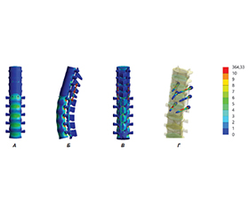 Background. Fractures of the thoracolumbar junction (Th11-L2) are among the most common spinal injuries and frequently lead to post-traumatic deformities and neurological complications. The most widespread surgical treatment is short-segment pedicle fixation; however, questions remain regarding the necessity of including the fractured vertebra in the construct and the optimal screw length. Objective: to evaluate the stress-strain state of the thoracolumbar spine with a Th12 vertebral body fracture of type A1 according to the AO Spine classification, and to determine the influence of the main pedicle screw length and the presence of intermediate screws in the fractured vertebra during short-segment fixation. Materials and methods. A three-dimensional finite element model of the thoracolumbar spine (Th9-L5) was constructed based on computed tomography data. A type A1 Th12 vertebral body fracture (AO Spine classification) was simulated. Four short-segment pedicle fixation configurations were analyzed: short screws without intermediate screws; long screws without intermediate screws; short screws with intermediate screws in the Th12 vertebral body; long screws with intermediate screws in the Th12 vertebral body. An axial compressive load of 350 N was applied. Stress distribution was analyzed using the finite element method according to the von Mises criterion. Results. The distribution of stresses in the vertebral bodies showed only minor variations (2–3 %) across the models. The basic four-screw construct provided sufficient unloading of the fractured vertebra. Adding intermediate screws reduced stress in the main screws, particularly at Th11, but doubled stress levels in the supporting rods. The use of long bicortical screws exerted a moderate unloading effect on the bony structures but increased stress within the screws themselves, especially at L1. Conclusions. In cases of type A1 compression fractures requiring surgical management, short-segment four-screw fixation ensures adequate spinal stability while minimizing the mechanical load on the fractured vertebra. The use of long screws and additional intermediate screws is more appropriate for severe injuries, whereas in simple compression fractures such modifications do not offer significant biomechanical advantages but increase surgical invasiveness.