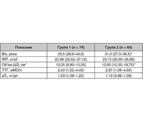 Актуальність. Вивчення постковідних імунних змін, у тому числі автоімунних уражень щитоподібної залози (ЩЗ), залишається одним з пріоритетних напрямів сучасної ендокринології. Мета: порівняти структурно-функціональні та імунні показники у хворих на автоімунний тиреоїдит (АІТ) залежно від перенесеного COVID-19. Матеріали та методи. Проведено ретроспективний аналіз перебігу АІТ залежно від перенесеного COVID-19 з оцінкою рівня тиреотропного гормону (ТТГ), тиреоїдних гормонів та антитиреоїдних антитіл. У групу дослідження включено 200 пацієнтів з АІТ: 193 жінки (96,5 %) і 7 чоловіків (3,5 %) віком від 18 до 62 років (середній вік становив 33,80 ± 0,60 року). Усі хворі були розподілені на 3 групи: група 1 — пацієнти, у яких АІТ було встановлено до перенесеного COVID-19 (73 особи), група 2 — пацієнти, у яких АІТ діагностовано після COVID-19 (111 осіб), і контрольна група — пацієнти з АІТ, які не хворіли на COVID-19 (16 осіб). Здійснено визначення рівнів ТТГ, вільного тироксину (вТ4), а також антитіл до тиреоїдної пероксидази (АТ-ТПО), тиреоглобуліну (АТ-ТГ) і рецептора ТТГ (АТ-рТТГ) методом хемілюмінесцентного імуноаналізу. Статистичну обробку даних проведено з використанням пакета статистичних програм Microsoft Excel і MedCalc Statistical Software v.19.7.2. Для порівняння груп застосовували критерій Манна — Уїтні; відмінності вважали значущими при p < 0,05. Результати. Після перенесеного COVID-19 у пацієнтів спостерігається вірогідне (p < 0,05) збільшення рівня АТ-рТТГ, що може свідчити про активацію автоімунних процесів у ЩЗ навіть за відсутності явної тиреоїдної дисфункції. Об’єм ЩЗ вірогідно (p < 0,05) збільшується після COVID-19, що може бути проявом постзапальних або реактивних змін паренхіми залози у відповідь на вірусне ураження. Висновки. Рівні класичних маркерів автоімунного тиреоїдиту (АТ-ТПО, АТ-ТГ) залишалися стабільними і не відрізнялися між групами, що вказує на ймовірну іншу імунну мішень або механізм ураження ЩЗ після COVID-19.