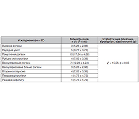 Актуальність. Бактеріальний кератит (БК) є поширеним і небезпечним інфекційним ураженням ока, що загрожує зоровій функції. Цукровий діабет (ЦД) 2-го типу збільшує ризик розвитку БК, що підтверджується зростанням частоти інфекцій очей у хворих на ЦД. В умовах воєнного стану в Україні доступ до своєчасної офтальмологічної допомоги обмежений, що погіршує клінічний перебіг та ускладнює лікування БК у пацієнтів із ЦД 2-го типу. Сучасні методи, зокрема оптична когерентна томографія (ОКТ), дадуть змогу оцінити морфофункціональний стан рогівки й динаміку лікування. Мета: дослідити особливості етіологічних чинників, клінічного перебігу та частоти ускладнень бактеріального кератиту у пацієнтів із цукровим діабетом 2-го типу в умовах воєнного стану в Україні. Матеріали та методи. Під спостереженням перебували 57 пацієнтів (57 очей) з бактеріальним кератитом та ЦД 2-го типу. Аналізували етіологію, клінічні особливості, гостроту зору, показники ОКТ рогівки на момент звернення та в динаміці до 3 місяців. Статистичний аналіз виконували із застосуванням методів ANOVA, χ² та інших тестів із рівнем значущості p < 0,05. Результати. Найчастішими етіологічними чинниками були порушення режиму носіння контактних лінз (28,07 %), травматичне ураження рогівки сторонніми тілами (22,81 %), синдром сухого ока (17,54 %) та хімічні ушкодження (10,53 %). Відмічено поступове значуще покращення гостроти зору: некоригована гострота зору збільшилась у 5 разів, максимально коригована гострота зору — у 4 рази (p < 0,001). За даними ОКТ, відбулося вірогідне зменшення товщини рогівки (на 22 %), строми (на 25 %), а також товщини, ширини і площі інфільтрату (на 86–91 %) протягом 3 місяців лікування (p < 0,001). Найпоширенішими ускладненнями були помутніння рогівки (17,54 %), васкуляризація (12,28 %) і передній увеїт (8,77 %). Висновки. У пацієнтів із ЦД 2-го типу бактеріальний кератит найчастіше асоціюється з носінням контактних лінз та травмами рогівки. Виявлено значне покращення зорових функцій та морфологічних показників рогівки під час лікування. Отримані дані підкреслюють важливість своєчасної діагностики та адекватної терапії БК у пацієнтів із ЦД 2-го типу, особливо в умовах обмеженого доступу до медичної допомоги.