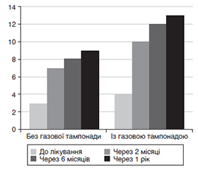 Актуальність. Вітреоретинальна хірургія ідіопатичних епіретинальних мембран (ЕРМ) є найбільш поширеним хірургічним втручанням на задньому відрізку ока. Видалення ЕРМ призводить до послаблення сітківки та сприяє відновленню її анатомічного рельєфу. При цьому в розвинутих стадіях процесу, коли через тривалу тракцію з боку ЕРМ розвивається зміщення шарів сітківки та її суттєве розтягнення, відновлення нормальної структури з нормальним фовеолярним контуром вкрай сповільнене, а іноді не відбувається взагалі. У таких випадках додатковий тиск на сітківку шляхом тампонади газово-повітряною сумішшю може позитивно впливати на відновлення рельєфу сітківки та поліпшення зорових функцій. Мета: провести порівняльну оцінку результатів вітреоретинальної хірургії ідіопатичних ЕРМ 3-ї та 4-ї стадії за Говетто із застосуванням та без застосування газової тампонади. Матеріали та методи. Обстежено 58 пацієнтів (66 очей) з ідіопатичними ЕРМ. Перша група (3-тя стадія за Говетто) — 36 очей, на 20 очах операцію виконували із тампонадою 15% газово-повітряною сумішшю перфторпропану і на 16 очах — без тампонади вітреальної порожнини. Друга група (4-та стадія за Говетто) — 30 очей, з них 17 очей із тампонадою 20% газово-повітряною сумішшю перфторпропану та 13 очей без тампонади. Виконували стандартне вітреоретинальне втручання із видаленням задньої гіалоїдної мембрани та ЕРМ без видалення внутрішньої пограничної мембрани (ВПМ), при пошкодженні ВПМ (6 очей у першій групі та 11 очей у другій групі) її видаляли протяжністю до середини відстані від фовеа до краю диска зорового нерва. Результати. Дослідження показали, що показники мінімальної товщини сітківки у фовеа, товщини центрального сектора сітківки, товщини всієї ділянки сітківки, що вимірювали, та об’єму ділянки, що вимірювали, значуще зменшились вже через 2 місяці на очах як з 3-ю, так і з 4-ю стадією захворювання при застосуванні газової тампонади; у випадках завершення операції без тампонади у цьому терміні спостереження зменшення цих показників не було значущим. Застосування тампонади дозволило статистично значуще збільшити кількість очей із нормальною еліпсоїдною зоною вже через 6 місяців та 1 рік спостереження як за 3-ї, так і за 4-ї стадії захворювання. У пацієнтів без тампонади вітреальної порожнини збільшення кількості очей із нормальною еліпсоїдною зоною навіть через рік спостереження не було значущим. Застосування газової тампонади дозволило вже через 2 місяці значуще поліпшити максимально кориговану гостроту зору (МКГЗ) із її подальшим поліпшенням протягом року спостереження. Відновлення МКГЗ на очах без тампонади було значно повільнішим порівняно з випадками без тампонади. Висновки. Проведені дослідження підтвердили високу ефективність застосування 15% газово-повітряної суміші перфторпропану на очах із 3-ю стадією ЕРМ за Говетто та 20% газово-повітряної суміші на очах із 4-ю стадією за Говетто в досягненні більш швидкого відновлення рельєфу сітківки, відновлення еліпсоїдної зони та гостроти зору порівняно із хірургією без тампонади вітреальної порожнини.