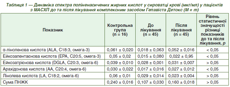 Мета дослідження: визначити вплив комбінованого засобу Гепавіста Детокс на динаміку маркерів оксидативного стресу та вміст поліненасичених жирних кислот у сироватці крові пацієнтів з МАСХП.