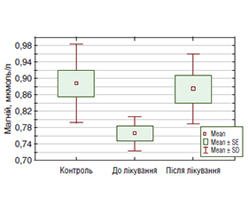 Актуальність. Функціональна біліарна дисфункція належить до поширених порушень моторики жовчного міхура і суттєво знижує якість життя пацієнтів. Сучасні терапевтичні стратегії залишаються обмеженими, що підкреслює необхідність пошуку безпечних немедикаментозних підходів. Одним із перспективних напрямів є застосування мінеральних вод, здатних впливати на моторику жовчного міхура, мінеральний баланс та процеси оксидативного стресу. Мета: оцінити вплив мінеральної води Aqua Миргород Detox на моторну функцію жовчного міхура та біохімічні показники сироватки крові у пацієнтів із біліарною дисфункцією. Матеріали та методи. У дослідження включено 10 пацієнтів із біліарною дисфункцією (середній вік становив (48,0 ± 2,25) року). Протягом 7–8 діб пацієнти отримували мінеральну воду Aqua Миргород Detox у дозі 200 мл тричі на добу. До і після курсу проводили клінічне обстеження, УЗД жовчного міхура з визначенням об’єму та скорочувальної функції, а також лабораторний аналіз рівня макро- (Ca, Mg, Na, K) та мікроелементів (Cu, Fe) і продуктів перекисного окиснення ліпідів. Додатково розраховували інтегральні коефіцієнти (Na/K, Ca/Mg, Cu/Fe, MDA/Mg). Результати. Встановлено, що вже через 10 хв після прийому мінеральної води скорочення жовчного міхура становило (19,36 ± 2,47) %, а через 50 хв — (45,36 ± 3,02) %. Після курсу терапії у всіх пацієнтів відзначалася гомогенізація жовчі та зникнення сладжу. Біохімічні показники засвідчили зростання рівня магнію з (0,77 ± 0,04) до (0,87 ± 0,03) ммоль/л, p = 0,017, зниження концентрації міді з (19,80 ± 0,85) до (17,59 ± 0,68) мкмоль/л, p = 0,004, та зменшення рівня малонового діальдегіду з (6,63 ± 0,60) до (4,18 ± 0,30) мкмоль/л, p = 0,018. Аналіз співвідношень виявив вірогідне зниження коефіцієнта Ca/Mg (p = 0,039) та MDA/Mg (p = 0,018), що відображає підвищення антиоксидантного потенціалу. Висновки. Мінеральна вода Aqua Миргород Detox чинить виражений холекінетичний ефект, сприяє нормалізації ехоструктури жовчі, покращує магнієвий баланс і знижує інтенсивність оксидативного стресу. Комплексний аналіз біохімічних показників підтверджує доцільність її застосування як немедикаментозного підходу у лікуванні пацієнтів із біліарною дисфункцією.
