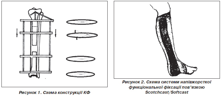 В експерименті ми доказали, що такі конструктивні удосконалення максимально підвищують жорсткісні характеристики КФ і дозволяють уникнути багатьох недоліків і ускладнень [9]. Після демонтажу КФ накладалася система напівжорсткої функціональної фіксації пов’язкою Scotchcаst/Softcаst (рис. 2).