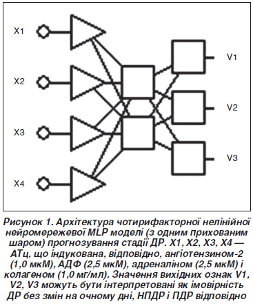 Background. To date, all the factors that determine the speed and nature of the development and progression of diabetic retinopathy (DR) in type 2 diabetes mellitus (T2DM) have not been fully established. The development of informative methods to diagnose and predict the course of intraretinal microcirculation disorders in DR is relevant. Platelets are considered an important factor in the development of retinal hemorrhages in diabetes. Purpose: to investigate the role of platelet function disorders in the development of diabetic retinopathy in type 2 diabetes. Materials and methods. Observation involved 100 patients (100 eyes) with T2DM and various stages of DR. Examination was carried out at the time of the patient’s application for specialized medical care before the start of treatment. The following agonists (aggregation inducers) were used in the study: adenosine diphosphate (ADP); adrenalin; collagen; angiotensin II; platelet-activating factor (PAT). Statistical analysis was performed using the MedStat, MedCalc v. 17 and the package for building and analyzing neural network models Statistica Neural Networks v. 4.0B. Results. The research has found that in patients with DR, platelet response to agonists such as adrenaline, collagen, angiotensin II, PAT, and ADP changes ambiguously, which is due to the presence of different clusters of receptor functional activity. In patients with non-proliferative DR, a prothrombogenic (hyperadrenoreactive) phenotype of platelets was found, which can create conditions for the progression of the disease under the influence of collagen, angiotensin II and PAT. In patients with proliferative DR, the progression of hemorrhages, the development of inflammation, and neovascularization occur with the participation of prothrombogenic (hyperangiotensin) phenotype of platelets, which is characterized by a high response to ADP and PAT. Based on the obtained data, a neural network model for predicting the development of DR stages was developed and put into practice. Conclusions. 1. An increase in the functional activity of glycoprotein VI receptors to collagen, α2 adrenergic and angiotensin I receptors, purinergic (P2Y1 P2Y12) and PAT receptors of platelets was detected for the first time in patients with DR, it manifested by different phenotypes and receptor clusters. This phenomenon reflected the individual reactivity of patients to the influence of pathogenetic factors of DM (exposure of vascular wall collagen, activation of the sympathoadrenal and renin-angiotensin systems, autocrine stimulation of platelets and the development of inflammation) on thrombogenesis. 2. A two-fold increase was found in the serum content of the pro-inflammatory cytokine interleukin-1β without changes in the fundus (p < 0.001) in patients with T2DM compared to controls. A high correlation of adrenaline- (r = 0.805; p < 0.001) and PAT-induced (r = 0.604; p < 0.01) platelet aggregation with the level of interleukin-1β testified to the relationship between platelet reactivity and systemic inflammatory response. 3. Based on the research results, a neural network model for predicting the stages of DR was developed and put into practice for the first time. The linear model for predicting disease stages is based on the analysis of two factors: platelet aggregation induced by collagen, and ADP; the prediction accuracy was 81.8 % (95% CI 73.5–88.8 %).