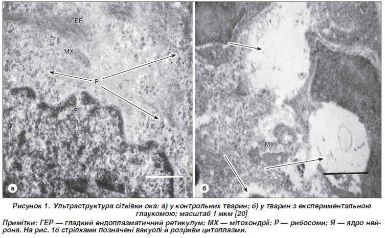 Порівнявши ультраструктуру сітківки ока у тварин після моделювання глаукоми й контрольних тварин, виявили, що при експериментальній глаукомі в сітківці відбуваються деструктивні зміни нейронів сітківки з утворенням великих вакуоль і розривів, тотальним просочуванням тканини плазмою крові (рис. 1).