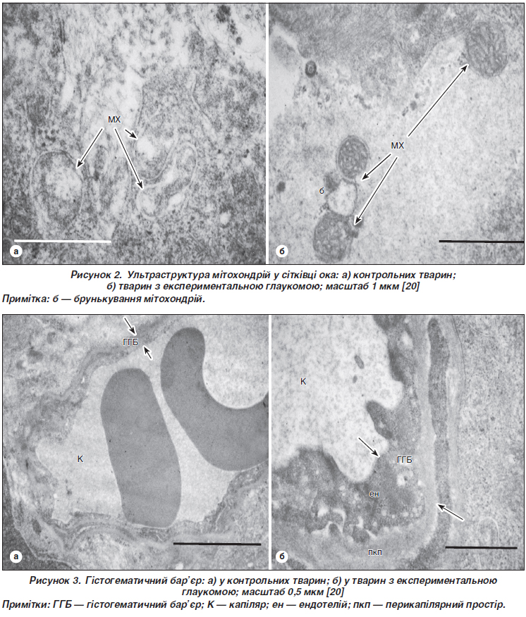 У результаті наших досліджень визначено, що товщина ГГБ зростала у 2,7 раза, ендотеліальної устілки — у 3 рази, а перикапілярних просторів — у 2,6 раза. Отже, відбувалося значне зростання шляху дифузії для кисню від капіляра до споживаючих структур — МХ, що поряд зі зменшенням їх здатності до забезпечення адекватної енергопродукції через руйнування та ультраструктурні зміни призводить до розвитку вторинної тканинної гіпоксії. Остання, у свою чергу, посилює нейродегенерацію і погіршує функцію сітківки [20].