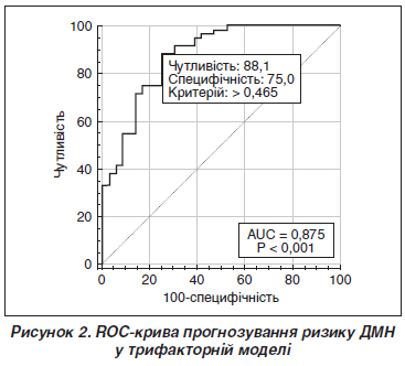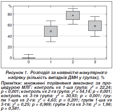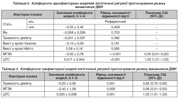 Актуальність. При початковому діагнозі цукрового діабету (ЦД) понад 25 % хворих уже мають ранню стадію діабетичної ретинопатії (ДР), а 60–80 % хворих із тривалістю ЦД 2-го типу понад 20 років мають ДР різного ступеня тяжкості. Близько половини пацієнтів з ДР з високою імовірністю матимуть сліпоту протягом 5 років захворювання, що обумовлено високим ризиком розвитку діабетичного макулярного набряку (ДМН). Мета дослідження: встановити особливості розвитку діабетичного макулярного набряку і різних стадій діабетичної ретинопатії при цукровому діабеті 2-го типу. Матеріали та методи. Дослідження включало 124 пацієнтів (124 ока) із ЦД 2-го типу, у яких за класифікацією ETDRS виявлена легка (29 очей, 1-ша група), помірна або тяжка (35 очей, 2-га група) непроліферативна ДР і проліферативна ДР (31 око, 3-тя група); контрольну групу становили 29 хворих без ЦД. Усім пацієнтам були виконані загальноприйняті офтальмологічні дослідження, спектрально-доменна оптична когерентна томографія (ОКТ) з визначенням центральної товщини сітківки (ЦТС, мкм). ДМН встановлювали, якщо при виконанні спектрально-доменної ОКT за протоколом ETDRS показники ЦТС перевищували значення нормативної бази даних. Для статистичних досліджень використано програмні пакети MedStat і MedCalc v.15.1 (MedCalc Software bvba). Результати. За віком наймолодшими були пацієнти з проліферативною ДР (на 6,2–6,4 року; p = 0,002). При цьому тривалість діабету була найбільшою саме в цих пацієнтів (12 років; p < 0,001). Частота ДМН серед пацієнтів з ДР становила 62,1 %. Вірогідної різниці щодо його частоти по групах пацієнтів із ДР виявлено не було (p > 0,2). Однофакторний регресійний аналіз виявив зниження (р < 0,001) ризику виникнення ДМН зі зростанням гостроти зору (СШ = 0,05; 95% ДІ 0,01–0,22) і зростання (р < 0,001) ризику ДМН із зростанням ЦТС (СШ = 1,02; 95% ДІ 1,01–1,03). Багатофакторний регресійний аналіз відібрав 3 значущих фактори ризику ДМН: тривалість діабету, гострота зору і ЦТС. Модель, що була побудована на виділених ознаках, адекватна (χ2 = 45,4; р < 0,001) при чутливості 88,1 % (95% ДІ 77,1–95,1 %) і специфічності 75,0 % (95% ДІ 57,8–87,9 %). Висновки. Наше дослідження показало відсутність прямої залежності ДМН від стадій ДР і дозволило визначити прогностичні ознаки його розвитку.