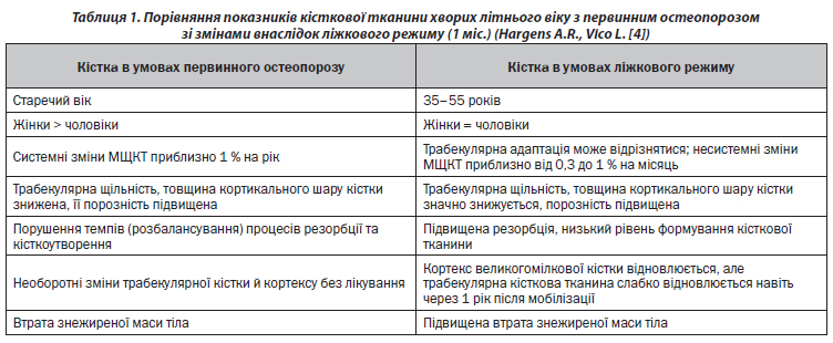 A.R. Hargens, L. Vico [4] провели порівняння показників МЩКТ і морфологічних змін кістки в літніх осіб з остеопорозом і осіб середнього віку після 1 міс. ліжкового режиму (табл. 1). Наведені дані свідчать, що тривалий ліжковий режим викликає зміни в структурній організації кістки. Порівняльний аналіз щільності кісткових трабекул і товщини та щільності кортикального шару кістки продемонстрував переважання виявлених порушень в осіб в умовах ліжкового режиму порівняно з показниками хворих на остеопороз. Однак у хворих на остеопороз без лікування настають необоротні зміни трабекулярної кісткової тканини, тоді як за умов ліжкового режиму після відновлення фізичної активності встановлено збільшення товщини й щільності кортексу кістки.