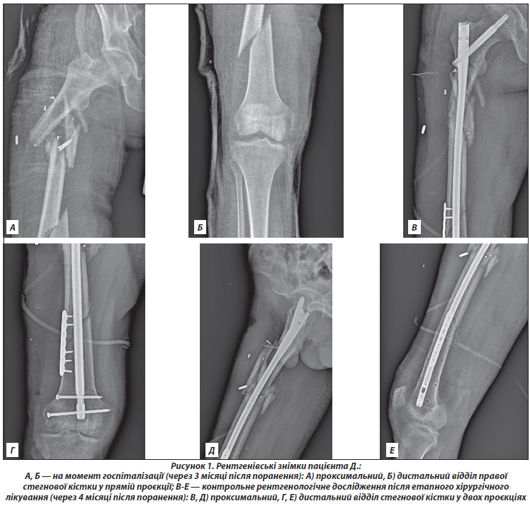 Клінічний випадок 1. Пацієнт Д., 44 роки. Стан після вогнепального кульового поранення (04.04.2022) — вогнепальний багатоуламковий перелом діафізу правої стегнової кістки зі зміщенням фрагментів. Після отримання поранення потрапив у полон, де перебував близько 3 місяців. Права кінцівка була зафіксована побратимами за допомогою підручних засобів, 3 місяці лежав, на праву кінцівку не спирався. Госпіталізований у стаціонар після звільнення з полону. Після стабілізації соматичного стану пацієнта й виконання металоостеосинтезу правої стегнової кістки (рис. 1) через 4 міс. після травми пацієнту проведене обстеження кісткової тканини.