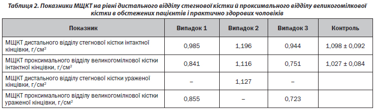 За даними ДРА, показники МЩКТ на рівні поперекового відділу хребта, проксимального відділу та шийки стегнової кістки у всіх пацієнтів були в межах нормальних значень і вірогідно не відрізнялась від показників здорових чоловіків. Проте на рівні дистального відділу стегнової кістки й проксимального відділу великогомілкової кістки у двох пацієнтів МЩКТ була нижчою, а в одного (пацієнт Г.) мала показники, схожі з групою порівняння. Мала кількість спостережень не дозволяє зробити висновки про статистичну значущість зареєстрованих відмінностей (табл. 2).