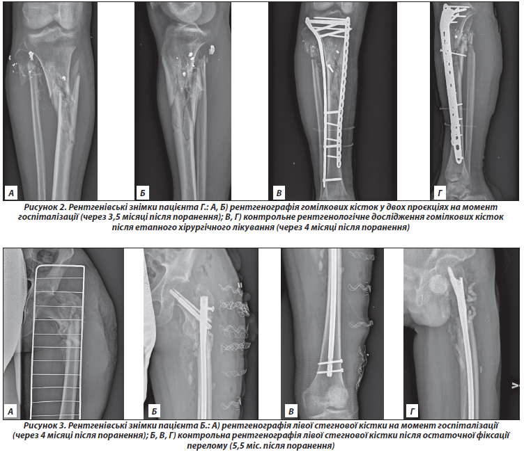 Клінічний випадок 2. Пацієнт Г., 32 роки. Вогнепальне осколкове поранення (18.03.2022), неправильно консолідований вогнепальний перелом обох кісток верхньої третини правої гомілки зі зміщенням. Перебував у полоні. Госпіталізований через майже через 4 місяці після отримання поранення. За час полону медичну допомогу не отримував, за винятком первинної обробки рани. Перебував на вимушеному ліжковому режимі, на нижню кінцівку не спирався. Обстеження кісткової тканини проведено після стабілізації соматичного стану й проведення багатоетапного хірургічного лікування через 4 міс. після травми (рис. 2).
