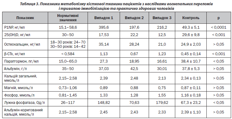 Оцінка лабораторних показників кісткового ремоделювання встановила значно підвищені показники резорбції і формування кісткової тканини на тлі низького вмісту вітаміну D у всіх пацієнтів (табл. 3).