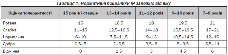 Для оцінки толерантності до фізичного навантаження використовуються проби з дозованим фізичним навантаженням. Однією із найбільш широко вживаних в Україні, швидкою та доступною методикою оцінки толерантності до фізичного навантаження у дітей є проба Руф’є. Згідно з чинною «Інструкцією розподілу учнів на групи для занять на уроках фізичної культури», затвердженою Наказом Міністерства охорони здоров’я (МОЗ) України та Міністерства освіти і науки України № 518/674 від 20.07.2009 року, визначення функціонально-резервних можливостей ССС проводиться за пробою Руф’є. Методика проведення функціональної проби така: дитина повинна виконати 30 присідань з витягнутими вперед руками протягом 45 с. Після 3–5 хв відпочинку у положенні сидячи в обстежуваного підраховують пульс кожні 15 с, доки не буде отримано 2–3 однакові цифри (ЧСС1). Отримані дані записують до протоколу, і пропонується виконати ще раз 30 присідань. Після закінчення вправи дитина сідає і проводиться підрахунок пульсу за перші 15 с першої хвилини відновлення (ЧСС2) та за останні 15 с першої хвилини відновлення (ЧСС3). Далі обчислюють індекс Руф’є (ІР) за такою формулою: ІР = (4 × (ЧСС1 + ЧСС2 + + ЧСС3) – 200)/10. Рівні функціонального резерву серця визначаються з урахуванням п’яти градацій: менше ніж 3 — високий рівень; 4–6 — вище від середнього (добрий); 7–9 — середній; 10–14 — нижче від середнього (задовільний); більше ніж 15 — низький [27, 29]. Також для більш детальної оцінки толерантності до фізичного навантаження доцільно брати до уваги вік дитини (табл. 1) [44].