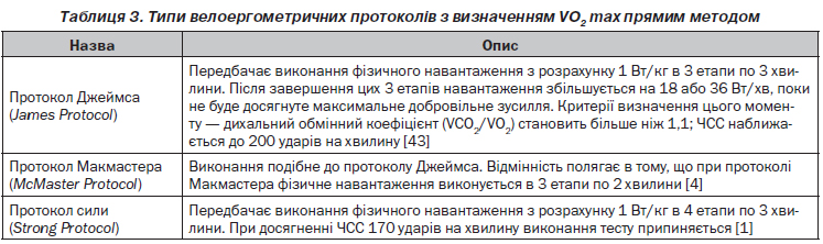 Проведення тестування з фізичним навантаженням відбувається згідно з протоколами виконання проб. Протокол являє собою опис стандарту виконання тесту таким чином, щоб пацієнт досягнув межі толерантності до фізичного навантаження за 10 ± 2 хвилини. Найбільш широко використовувані протоколи поділяються на такі категорії: 1) багатоступеневе поступове виконання вправ (збільшення фізичного навантаження кожні 2 або 3 хвилини з псевдостаціонарним станом на кожному етапі); 2) прогресивно поступове (щохвилинне) або постійно зростаюче фізичне навантаження (пандус); 3) постійний темп фізичних вправ (5–10 хвилин). Перед виконанням протоколу обов’язковою є розминка (3 хвилини), після — реєстрація періоду відновлення (від 5 до 10 хвилин). Можливі варіанти велоергометричних протоколів з визначенням VO2 max прямим методом наведені в табл. 3 [30].