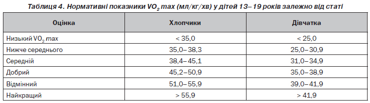 Описані фактори, а також відхилення роботи центрального та периферичного компонентів ускладнюють можливість створення стандартизованих показників для оцінки VO2 max. Проте при огляді літератури нами було встановлено, що найбільш поширеним та цитованим варіантом аналізу VO2 max у дітей є класифікація, що наведена в табл. 4 [18].