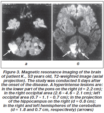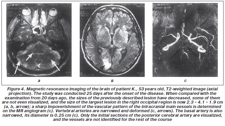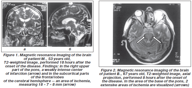For illustration, we present a case of a patient M., 46 years old, who was treated in the general intensive care unit of the Hospital. The patient was delivered to the Hospital with impaired consciousness, oculomotor disorders, trismus, impaired VII pair of cranial nerves, tetraplegia, cerebellar dysfunction, manifestations of hormetonial seizures, and had a one-and-a-half syndrome, which was clinically manifested with ophthalmoplegia of the right eyeball in all directions when the left eyeball moved only outwards. A total combined pontine infarction was di-agnosed.