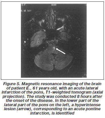 In 4 (17.4 %) patients, the clinical picture corresponded to a ventral-medial infarction of the pons Varolii, in 8 (34.8 %) cases to a medial tegmental infarction, in 5 (21.7 %) patients to a bilateral medial infarction, in 2 (8.7 %) — to a lateral infarction, 4 (17.4 %) patients has total pontine infarction. The average size of the pontine lesion was 3.4 cm3.