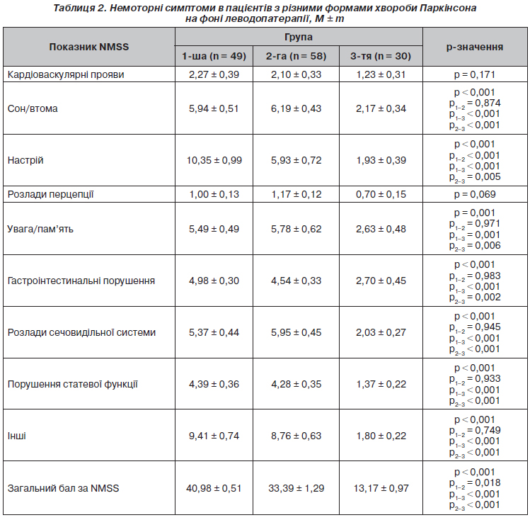 Оцінка вираженості немоторних симптомів при різних формах ХП наведена в табл. 2.