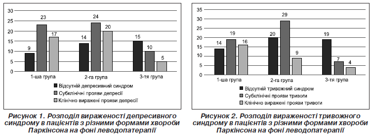 Нами виявлено відсутність депресивного синдрому в 9 (18,4 %) осіб у 1-й групі, 14 (24,1 %) осіб у 2-й групі й 15 (50,0%) осіб у 3-й групі, субклінічні депресивні прояви — у 23 (46,9 %) осіб у 1-й групі, у 24 (41,4 %) осіб у 2-й групі та 10 (33,3 %) осіб у 3-й групі, а також клінічно виражені депресивні прояви — в 17 (34,7 %), 20 (34,5 %) і 5 (16,7 %) пацієнтів відповідно.
