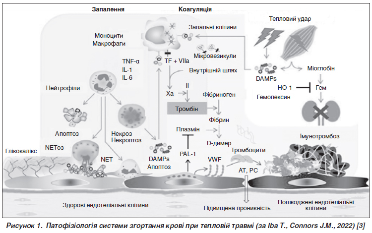 Запалення і коагуляція є двома основними факторами, що призводять до згубної дисфункції органів при тепловому ударі. Термічне ураження тканини спричиняє молекулярне пошкодження (DAMPs) і стимулює вивільнені макрофаги/моноцити до вироблення цитокінів (фактора некрозу пухлини (TNF) α та інтерлейкінів (IL-1b, IL-6 тощо)) через продукцію запальних клітин. У той же час активовані макрофаги/моноцити експресують тканинний фактор (TF) і вивільняють мікровезикули, які ініціюють коагуляцію. Запальні цитокіни активують нейтрофіли й індукують різні типи загибелі клітин, наприклад апоптоз, некроз/некроптоз, піроптоз і NEToз. Позаклітинні пастки нейтрофілів (NET) і адгезовані нейтрофіли пошкоджують ендотеліальні клітини і сприяють тромбозу. Зовнішні й внутрішні шляхи спільно активують каскади коагуляції з генерацією критичного медіатора тромбіну. Тромбін додатково активує як запалення, так і коагуляцію і спричиняє утворення «запального тромбу». Пошкодження ендотелію призводить до зменшення фібринолізу внаслідок продукції інгібітору активатора плазміногену 1-го типу (PAI-1) і підвищення проникності й втрати природних антикоагулянтів (антитромбін (AT) і протеїн C (PC)). Пошкоджена ендотеліальна клітина вивільняє фактор фон Віллебранда, який стимулює агрегацію тромбоцитів (рис. 1) [3].