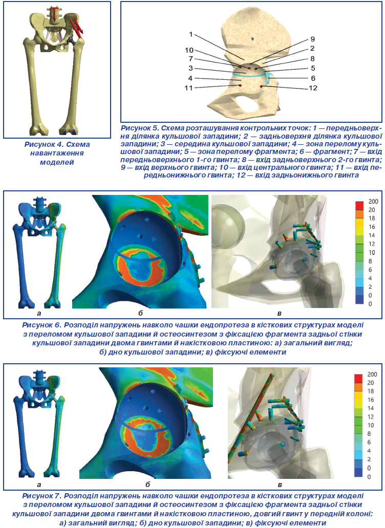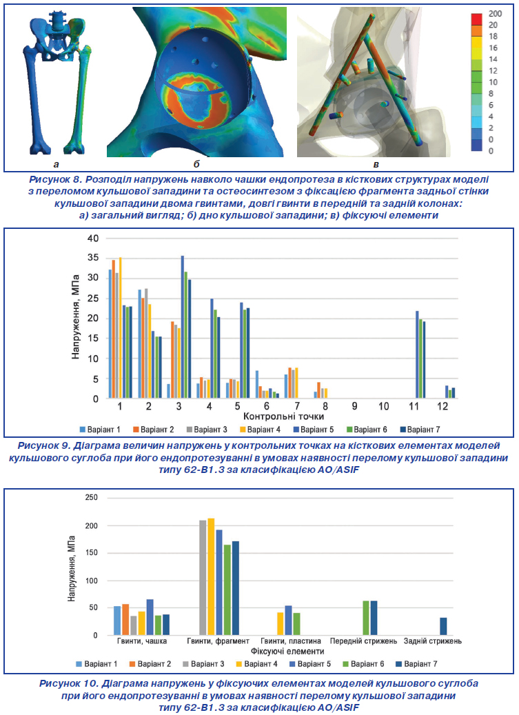 На самих гвинтах, що фіксують чашку ендопротеза, спостерігається незначне підвищення рівня напружень до 37,8 МПа, також напруження підвищуються на гвинтах, що фіксують фрагмент задньої стінки западини, до 171,2 МПа. Напруження на стрижні в передній колоні практично не змінюється — 62,4 МПа, а на гвинті в задній колоні визначається на рівні 32,2 МПа.