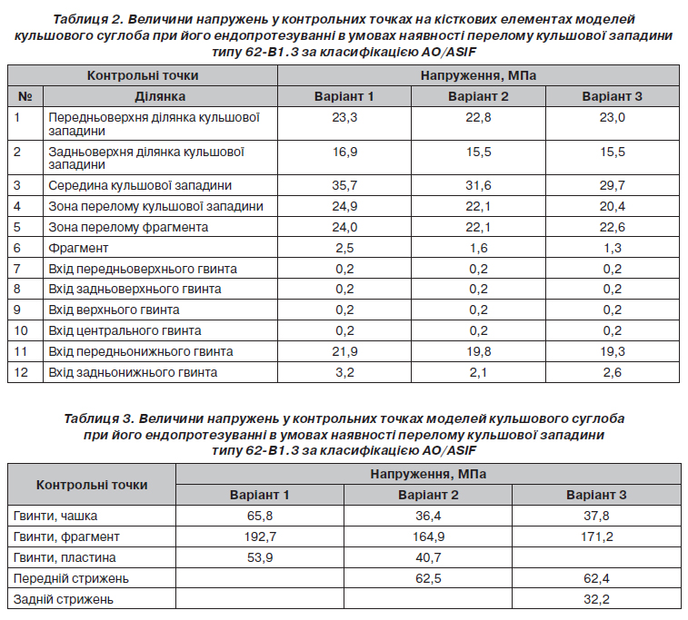 2. Використання додаткових засобів остеосинтезу дозволяє знизити рівень напружень в кісткових елементах моделі, а також на гвинтах, які фіксують чашку ендопротеза.