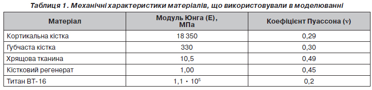 У нашому дослідженні матеріал вважався однорідним та ізотропним. Як кінцевий елемент був обраний 10-вузловий тетраедр з квадратичною апроксимацією. Усі матеріали, з яких складалися моделі, одержали відповідні механічні властивості, такі як модуль пружності Юнга й коефіцієнт Пуассона. Механічні властивості біологічних тканин було обрано згідно з даними літератури [5–8]. Властивості металоконструкцій було обрано відповідно до даних технічної літератури [9]. Дані про механічні характеристики матеріалів, що використовували в моделюванні, наведені в табл. 1.