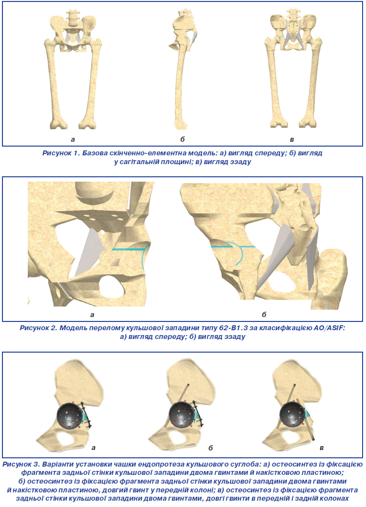 Мета: дослідити зміни величин напружень у моделі кульшового суглоба при його ендопротезуванні з використанням чашки Jumbo cup в умовах наявності перелому кульшової западини типу 62-B1.3 за класифікацією АO/ASIF з використанням різних варіантів остеосинтезу.