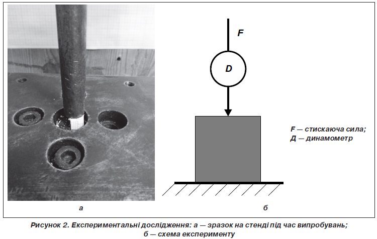 Усі зразки випробували на стискання. Силу стискання збільшували поступово до руйнування зразка. Схема експерименту наведена на рис. 2.
