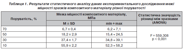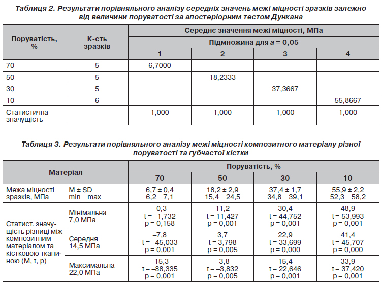 Дані були оброблені статистично. Розраховували середнє (М), стандартне відхилення (SD) та мінімальне і максимальне значення вибірок експериментальних даних для зразків з різною поруватістю. Порівняння межі міцності зразків проводили за допомогою одновимірного дисперсійного аналізу (ANOVA) та апостеріорного тесту Дункана. Для визначення достатньої міцності композитних матеріалів проведено одновибірковий порівняльний аналіз (Т-тест для одної вибірки), як значення, що перевіряються, були межі міцності губчастої кісткової тканини. Обробку даних проводили в пакеті прикладних програм IBM SPSS Statistic 20.0 [15].