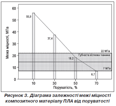 Для визначення меж достатньої поруватості композитного матеріалу ПЛА на діаграмі (рис. 3) показана інтерполяційна крива зміни межі міцності для різної поруватості. Наведені граничні та середні дані міцності губчастої кістки.