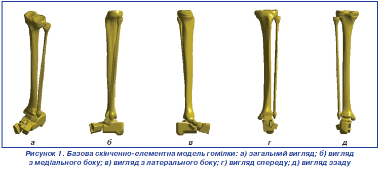 У лабораторії біомеханіки ДУ «Інститут патології хребта та суглобів ім. проф. М.І. Ситенка НАМН України» була розроблена базова скінченно-елементна модель гомілки людини [6]. Загальний вигляд моделі наведено на рис. 1.