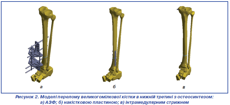 На базовій моделі моделювали перелом в нижній третині великогомілкової кістки та три види остеосинтезу за допомогою апарата зовнішньої фіксації (АЗФ), накісткової пластини та інтрамедулярного стрижня. У проміжку між кістковими фрагментами в зоні перелому імітували кістковий регенерат. Зовнішній вигляд моделей з переломом у нижній третині великогомілкової кістки та різними видами остеосинтезу наведено на рис. 2.
