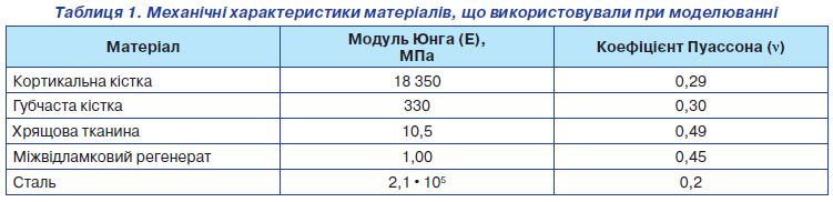 У нашому дослідженні матеріал вважали однорідним та ізотропним. Як скінченний елемент був обраний 10-вузловий тетраедр з квадратичною апроксимацією. Усім матеріалам, з яких складалися моделі, задавали відповідні механічні властивості, такі як модуль пружності Юнга і коефіцієнт Пуассона. Механічні властивості біологічних тканин обирали за даними літератури [7–10]. Властивості кісткового регенерату обирали з огляду на той факт, що це новоутворена тканина, яка активно змінює власні властивості в процесі свого росту й формування від 0 до показників здорової кісткової тканини. На якомусь початковому етапі свого формування він має модуль пружності 1,0 МПа. Властивості металевих конструкцій обирали за даними технічної літератури [11]. Дані про механічні характеристики матеріалів, використаних при моделюванні, наведені в табл. 1.