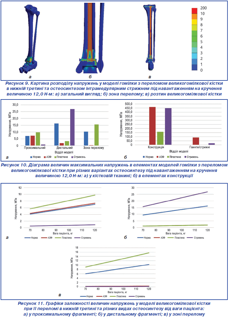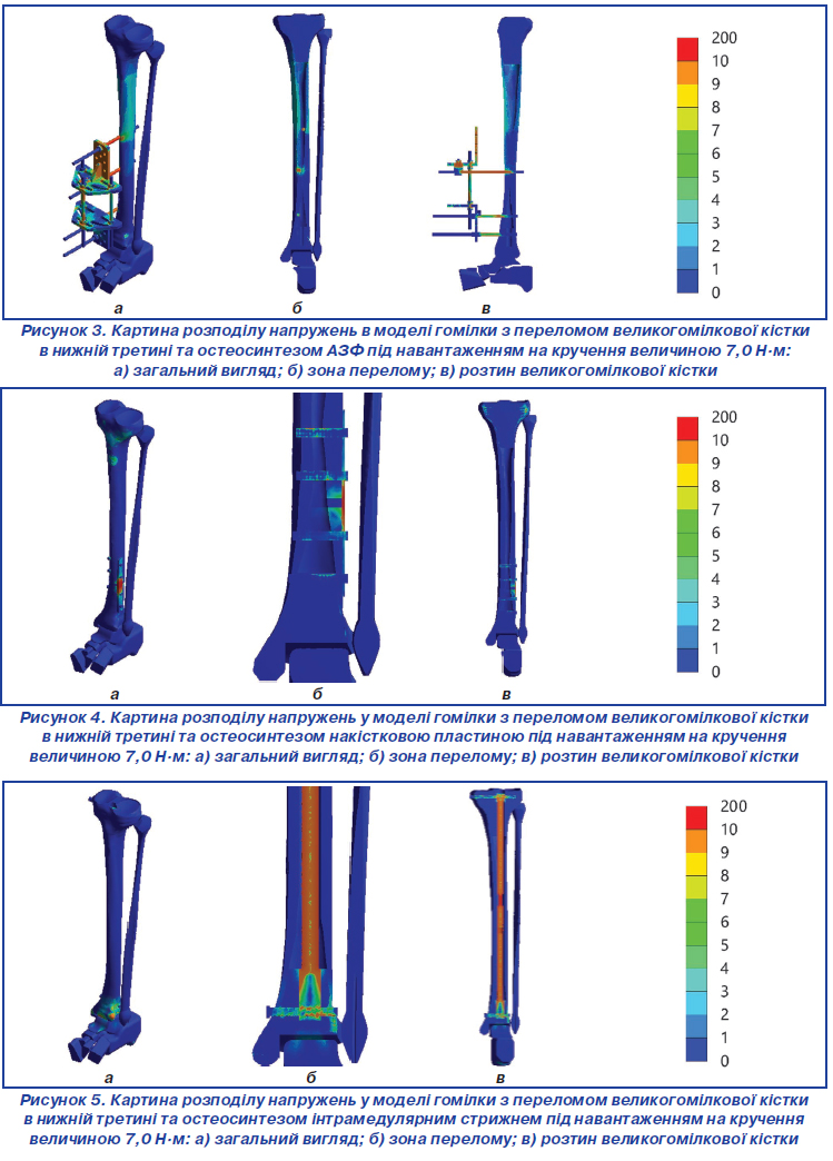3. Найнижчі показники напружень в зоні перелому (від 0,1 до 0,2 МПа) і проксимальному фрагменті великогомілкової кістки (від 0,5 до 0,9 МПа) визначаються при використанні остеосинтезу інтрамедулярним стрижнем, але в дистальному відділі рівень напружень є найвищим серед усіх варіантів остеосинтезу — від 15,7 до 26,9 МПа.