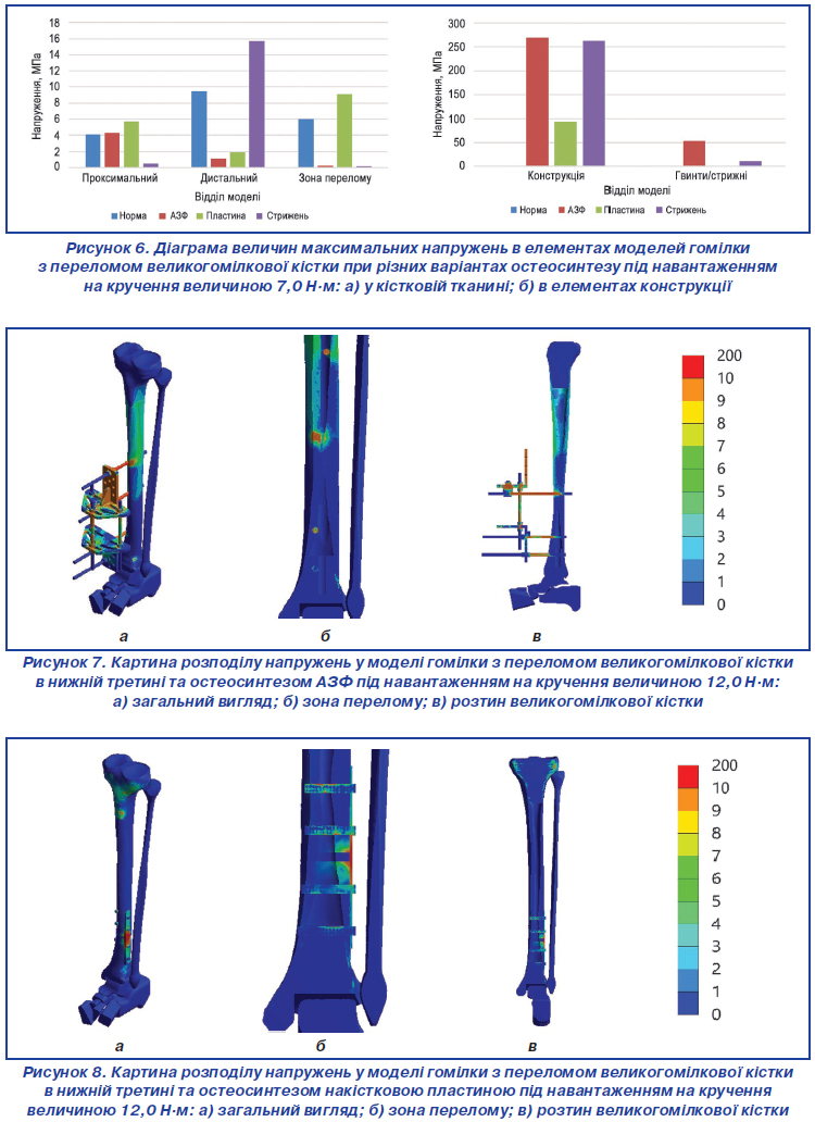 За наявності перелому великогомілкової кістки в її нижній третині при використанні остеосинтезу за допомогою АЗФ крутний момент величиною 7,0 Н·м викликає максимальні напруження 4,3 МПа на проксимальному кінці великогомілкової кістки. У нижче розташованих відділах усе навантаження сприймає на себе АЗФ, напруження на якому сягають позначки 269,0 МПа. Також високий рівень напружень 53,4 МПа спостерігається на фіксуючих гвинтах і навколо їх у кістковій тканині. Отже, це дозволяє зняти напруження з дистального фрагмента, де вони визначаються на рівні 1,1 МПа, і, що особливо важно, із зони перелому, де вони не перевищують 0,2 МПа.