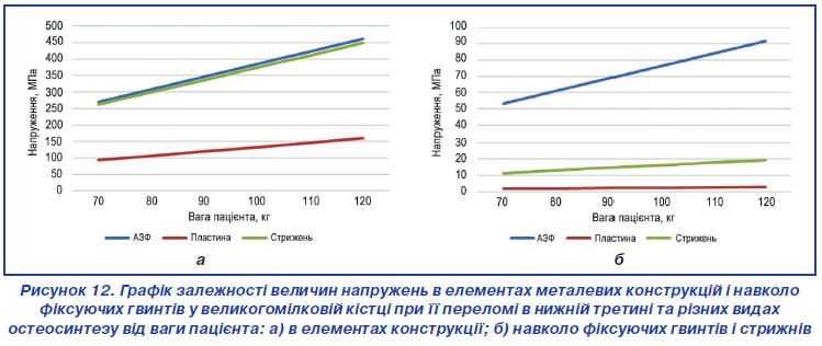 Для наочного уявлення про зміни величин напружень в елементах великогомілкової кістки при її переломі в нижній третині та різних видах остеосинтезу залежно від ваги пацієнта були побудовані графіки, наведені на рис. 11.