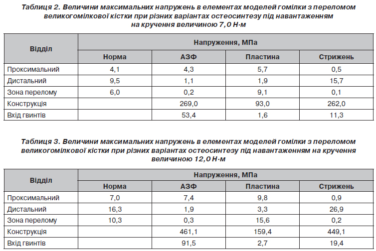 У табл. 3 наведені дані про величини максимальних напружень в елементах моделей гомілки з переломом великогомілкової кістки при різних варіантах остеосинтезу під навантаженням на кручення величиною 12,0 Н·м.
