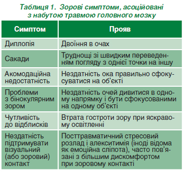 Функції зору часто не враховуються при діагностиці симптомів травми головного мозку, особливо під час початкового лікування травми. Проблеми із зором, якщо їх не лікувати, можуть мати серйозні наслідки [12]. Сучасні дослідження показують, що приблизно у 80 % людей, які отримали черепно-мозкові травми, виникає проблема із зором, яка є прямим результатом травм. Існує безліч типів травм головного мозку, які можуть призвести до розладів зору [13]. Перелік зорових симптомів, які асоціюють із набутою травмою головного мозку, наведено в табл. 1.