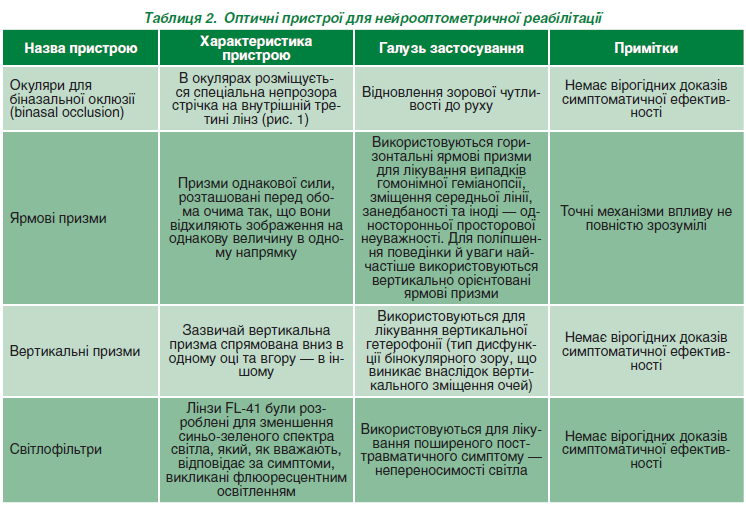 Клінічний досвід довів, що мікропризми є потужним інструментом для лікування симптомів посттравматичного зорового синдрому. Автори дослідження визначають, що, можливо, більшість змін у стані здоров’я були миттєвими, за винятком головного болю. Подальше застосування мікропризм у пацієнтів, які мали подібні проблеми, привело до дуже високого відсотка полегшення симптомів [8]. Пропонується застосовування низки пристроїв у сфері нейрооптометричної реабілітації для лікування стійких зорових скарг після легких черепно-мозкових травм. Інформація про оптичні пристрої наведена в табл. 2 [18].