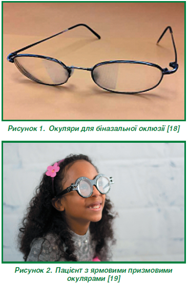 До таких оптичних пристроїв належать окуляри для біназальної оклюзії (в окулярах розміщується спеціальна непрозора стрічка на внутрішній третині лінз; рис. 1), ярмові призми (призми однакової сили, розташовані перед обома очима так, що вони відхиляють зображення на однакову величину в одному напрямку; рис. 2), вертикальні призми (корисні для постійного або тимчасового полегшення астенопічних симптомів, що виникають через вертикальне зміщення зорових осей) і світлофільтри.