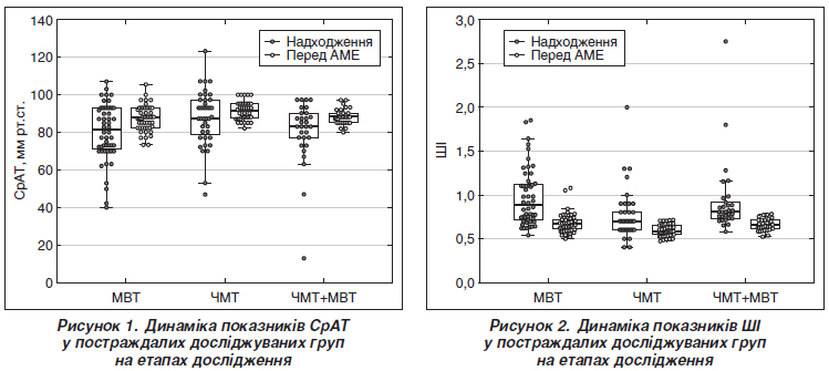 Стратегії лікування постраждалих із геморагічним шоком все ще є предметом наукового та клінічного інтересу, оскільки удосконалення підходів щодо швидкої та ефективної стабілізації постраждалих призведе до поліпшення виживання. Мета дослідження: порівняльна оцінка ефективності корекції крововтрати у постраждалих із проникними мінно-вибуховими травмами на етапі стабілізації та підготовки до аеромедичної евакуації (АМЕ). Матеріали та методи. У дослідженні ретроспективно за 3 роки (2016–2019 рр.) проаналізовано медичні карти 122 постраждалих, які отримали поранення під час виконання бойових завдань у районі проведення Антитерористичної операції/Операції об’єднаних сил. Постраждалих із бойовою травмою було розподілено на три групи. Усім постраждалим військовослужбовцям проводилася аеромедична евакуація гелікоптерами із польових госпіталів з метою переведення на етап надання спеціалізованої медичної допомоги. Ступінь шоку у постраждалих було визначено за допомогою методу арифметичного розрахунку шокового індексу (ШІ) Альговера та за даними лабораторних досліджень. Інфузійно-трансфузійна терапія на етапі стабілізації проводилася колоїдними та кристалоїдними розчинами, які при великих обсягах крововтрати доповнювалися переливанням свіжозамороженої плазми та еритроцитарної маси за традиційною схемою поповнення крововтрати на етапі надання медичної допомоги. Результати. У результаті проведення стабілізаційних заходів спостерігалося зниження ЧСС на 13,5 % (95% ДІ 11,2–15,7 %) на етапі підготовки до АМЕ. Спостерігалося зростання показника САТ у досліджуваних групах. Середній артеріальний тиск (СрАТ) у постраждалих із мінно-вибуховими торакоабдомінальними пораненнями під час госпіталізації становив 81,5 (71–93) мм рт.ст., а після проведення стабілізаційних заходів зріс до 88 (82–93) мм рт.ст. Встановлено вірогідну відмінність між групами мінно-вибухової та черепно-мозкової травми на етапах дослідження (p < 0,05). У результаті проведення стабілізаційних заходів вдалося знизити показники ШІ у досліджуваних групах на 23,7 % (95% ДІ 19,2–29,5 %). Висновки. Застосування комплексу стабілізаційних заходів у постраждалих із проникними мінно-вибуховими травмами на етапі госпіталізації дозволило поліпшити показники вітальних функцій та на 23,7 % (95% ДІ 19,2–29,5 %) знизити значення показників ШІ.