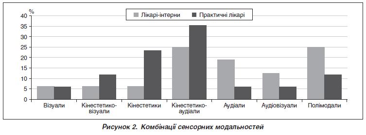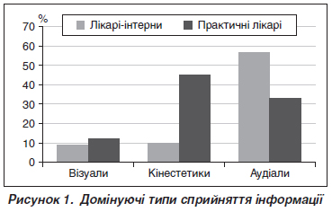 Актуальність. У сучасних літературних джерелах наведено, що з п’яти основних каналів, за посередництвом яких людина отримує інформацію (зір, слух, смак, нюх і тактильні відчуття), суб’єктами навчання переважно застосовуються тільки три — слуховий, зоровий і тактильний, які визначають аудіальний, візуальний і кінестетичний типи сприйняття. Мета: визначити типи сприйняття інформації у лікарів-інтернів і учасників тренінгів за спеціальністю «анестезіологія та інтенсивна терапія» для оптимізації процесу післядипломного навчання. Матеріали та методи. Було проведено анонімне анкетування 48 лікарів-інтернів і 51 практичного лікаря за спеціальністю «анестезіологія та інтенсивна терапія» за спеціальним опитувальником з наступним розшифруванням і аналізом за домінуючими каналами отримання інформації та їх комбінаціями. Результати. При оцінюванні провідних (домінуючих) сенсорних модальностей у групі лікарів-інтернів було відзначено значну перевагу слухового сприйняття серед інших каналів отримання інформації. Оцінка домінуючих сенсорних типів у групі учасників тренінгів, які мають власний певний досвід роботи за спеціальністю, показала значну перевагу кінестетичного інформативного каналу, якому дещо поступається аудіальний сенсорний тип, а візуальна модальність відзначена лише в 11,2 % респондентів. Задіяння більшості сенсорних аналізаторів і поєднання модальностей у навчальному процесі сприяє не тільки цілісному сприйняттю, аналізу й засвоєнню навчальної інформації, але й формуванню мультимодального мислення. Тому під час освітнього процесу слід застосовувати мультимодальні технології, які дозволяють надавати навчальний матеріал у кількох форматах одночасно. Висновки. 1. Лікарі-інтерни здебільшого продемонстрували домінування аудіокінестетичного і полімодального типів засвоєння інформації. 2. Лікарі-анестезіологи з певним досвідом практичної діяльності більш схильні до монокінестетичної та аудіокінестетичної інформаційної модальності. 3. Полімодальний тип надання навчальної інформації є оптимальним у післядипломній освіті медичних працівників. 4. Упровадження до навчального процесу короткотривалих тренінгів з оволодіння практичними навичками створює оптимальну комбінацію шляхів отримання суб’єктами навчання навчальної інформації та консолідації пам’яті.