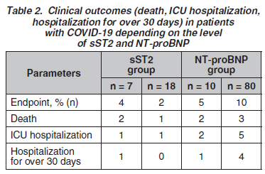 Background. COVID-19 may cause or worsen cardiac dysfunction and patients with pre-existing cardiovascular disease, including heart failure (HF), who have an increased risk of severe and fatal outcomes of COVID-19. The study aimed to determine the role of soluble suppression of tumorigenesis-2 protein (sST2) and natriuretic peptide test (NT-proBNP) in predicting the severe course and in-hospital mortality of patients with COVID-19 and hypertension. Materials and methods. One hundred and fifteen patients with COVID-19 and hypertension were examined. The determination of sST2 and NT-proBNP in blood serum were done using the enzyme-linked immunosorbent assay. The clinical endpoint was assessed during the hospitalization period (death, hospitalization in the intensive care unit, prolonged hospitalization). The risk of the final event development was calculated for the patients who reached the threshold sST2 concentrations, and, separately, based on the diagnostic values of the NT-proBNP. Results. The cut-off values of sST2 recommended for the diagnosis of HF in our study were reached in 7 (28 %) cases. The risk of final clinical points development in these patients was as follows: OR = 10.67; 95% CI: 1.31–86.9; p = 0.0270. The level of NT-proBNP, which meets the criteria for the diagnosis of HF, was constant in only 10 (11.1 %) individuals (p = 0.0461) and the risk of clinical events developing was equal to OR = 7.0; 95% CI: 1.72–28.6; p = 0.0067. Conclusions. Stratification of patients based on sST2 values, in addition to NT-proBNP parameters, may provide further prognostic value compared to NT-proBNP levels in patients with COVID-19 and HF.