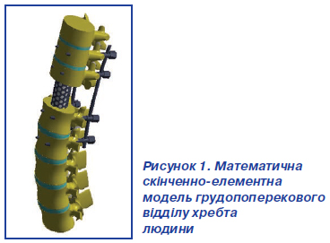 У лабораторії біомеханіки ДУ «Інститут патології хребта та суглобів ім. проф. М.І. Ситенка НАМН України» була розроблена математична скінченно-елементна модель грудопоперекового відділу хребта людини, яка містила хребці Тh9-Тh11, L1-L5, хребець Тh12 був видалений, а також елементи металоконструкцій — міжтілову опору та транспедикулярну систему. Зовнішній вигляд моделі наведено на рис. 1.