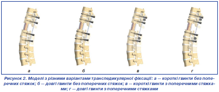 У процесі дослідження моделювали 4 варіанти транс-педикулярної фіксації з використанням коротких фіксуючих гвинтів та довгих гвинтів, які проходять через внутрішній кортикальний шар тіла хребця, а також з використанням двох поперечних стяжок та без них. Моделі з різними варіантами транспедикулярної фіксації наведені на рис. 2.