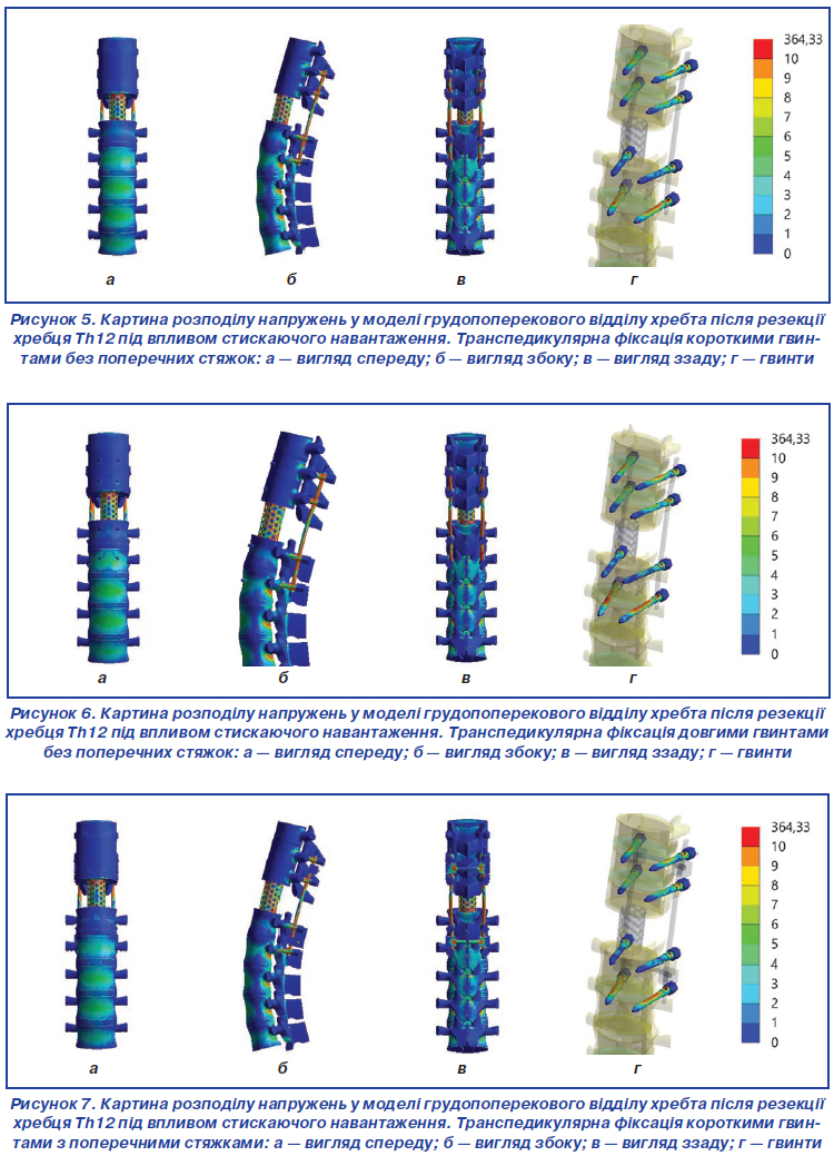 На елементах транспедикулярної конструкції визначається зниження механічних напружень на всіх фіксуючих гвинтах та в міжтіловій опорі. Величини напружень на поперечних стяжках визначаються на позначках 2,8 МПа між хребцями Th10-Th11 та 5,5 МПа — між хребцями L1-L2.