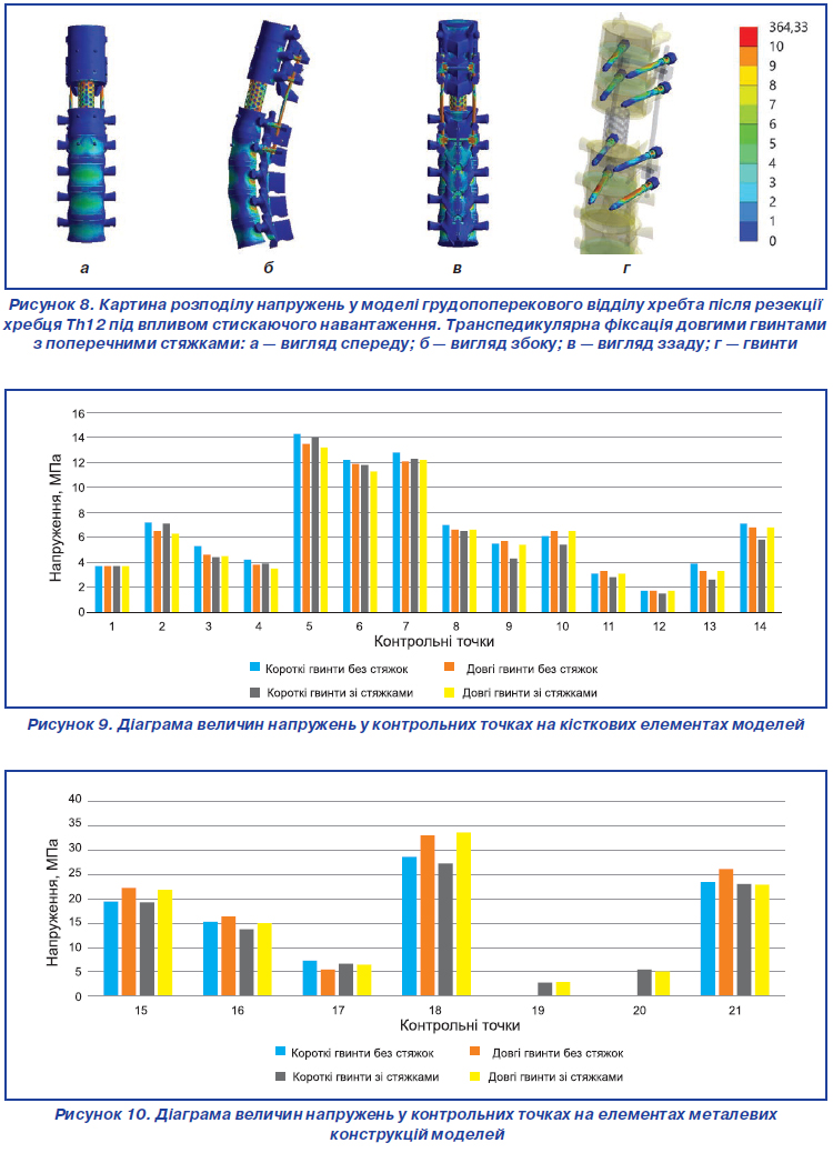 Як показали проведені дослідження, використання довгих фіксуючих гвинтів веде до зниження напружень у кісткових елементах моделі, практично в усіх конт-рольних точках. Виняток становлять зони контакту тіл хребців Th11 та L1 з міжтіловою опорою, де напруження підвищуються до 5,7 та 6,5 МПа відповідно, порівняно з фіксацією короткими гвинтами. При цьому визначається підвищення напруження в міжтіловій опорі до 26,2 МПа та на фіксуючих гвинтах, у хребці Th10 визначаються напруження в 22,3 МПа, у хребці Th11 — 16,4 МПа, і сягають максимуму в хребці L2 — 33,1 МПа. Виняток становлять гвинти, що фіксують хребець L1, на яких спостерігається зниження рівня напружень до 5,5 МПа.