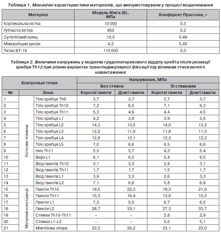 Дані про величини напружень в усіх контрольних точках моделей грудопоперекового відділу хребта після резекції хребця Th12 при різних варіантах транспедикулярної фіксації під впливом стискаючого навантаження наведені в табл. 2.